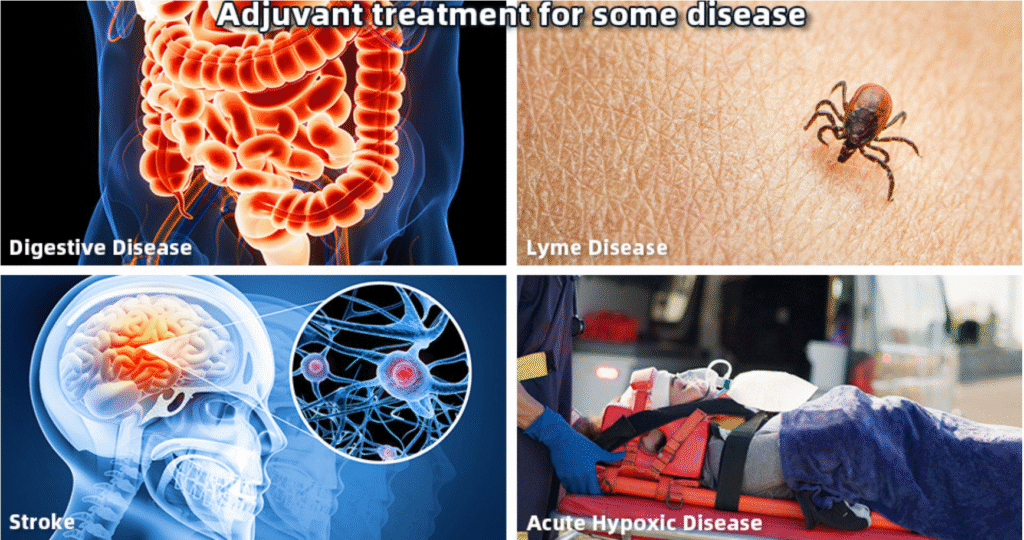 Nowadays, hyperbaric oxygen is often used as an adjunctive treatment method, i.e., conventional treatment as the basis, combined with hyperbaric oxygen therapy as an adjunct, such as the following diseases have very good results: Lyme Disease, Brain Injury, Stroke, Diabetes Autism, Cancer, Chronic Heart and Lung Disease, Acute Hypoxic Disease, Carbon Monoxide Poisoning, Digestive Disease, Burns.